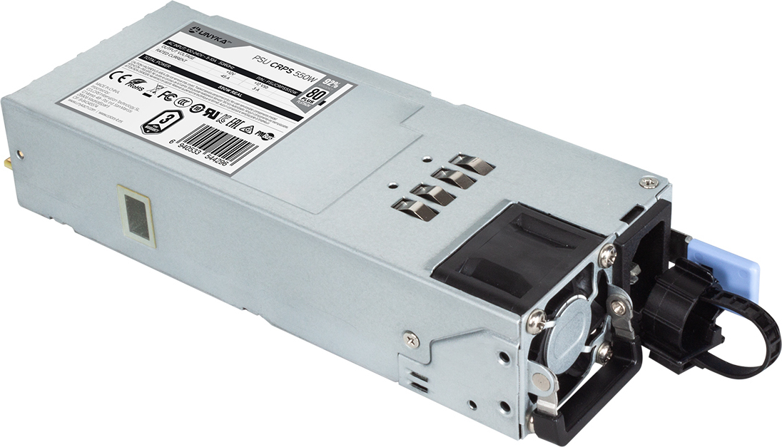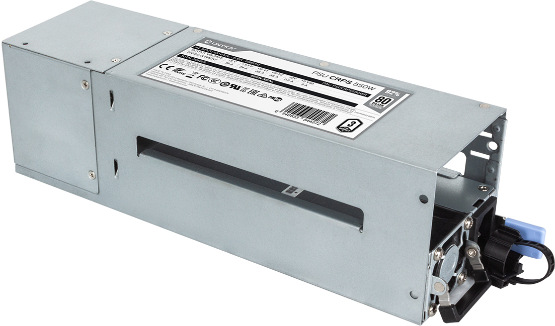La gama profesional de fuente de alimentación redundante de UNYKAch está diseñado con módulos intercambiables.En una situación normal, estos dos modulos de potencia compartirán automáticamente la carga para una eficiencia optima; si un módulo de alimentación falla, la unidad restante se hace cargo de inmediato, la unidad dañada puede reemplazarse sin detener la operación, evitando el riesgo de desaparición de datos o la interrupción del sistema.\n\nLa fuente de alimentación redundante CRPS 550W tiene una eficiencia 92% lo que hace que sea equivalente a la certificación 80 Plus Platinum.\n\nLa fuente de alimentación redundante CRPS 550W/800W dispone un adaptador para convertirse en formato ATX Estándar.